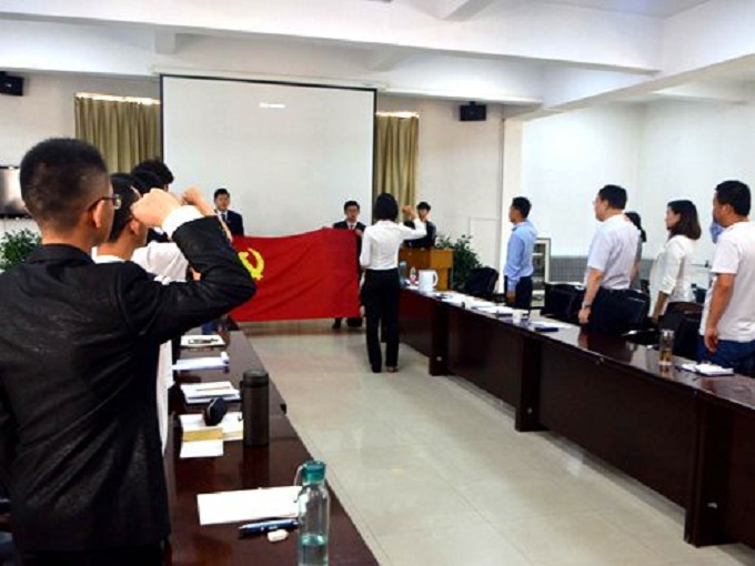 2018年6月30日上午,太阳成集团tyc151cc榆中校区党支部在榆中校区17号楼二楼圆厅开展迎七一暨庆祝中国共产党成立97周年主题党日活动。主题党日的内容为:观看纪录片《建党伟业》、学习习近平总书记在北京大学师生座谈会上的重要讲话精神心得分享、重温入党誓词三个部分。公司党委联系人公司党委书记黎军、公司党委副书记许倩、党支部委员何志伟及全体员工党员、入党积极分子共计80余人参加了本次活动。活动由支部书记周渊主持。