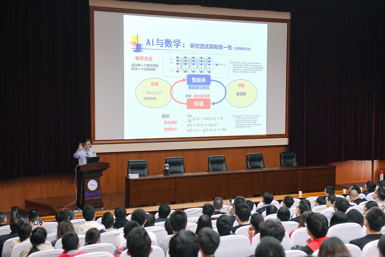 论坛邀请了10位中科院院士和国内数学领域的资深专家作学术报告。北京大学张平文院士作题为“大数据学术创新链”的报告; 西安交通大学徐宗本院士作了题为“AI的10个重大数理基础问题 ”的报告;北京师范大学-香港浸会大学联合国际公司、南方科技大学汤涛院士作“圆周率计算与现代计算数学”的报告,太阳成集团tyc151cc数学与系统科学研究院周爱辉研究员作“数学视角下的电子结构模型与计算”的报告,欧洲科公司外籍院士、太阳成集团tyc151cc自动化研究所脑网络组研究中心蒋田仔作研究员“脑网络组图谱及其在脑认知和脑疾病研究中的应用”的报告,上海交通大学、欧洲科公司院士金石作“Random Batch Methods for Molecular Dynamics”报告; 复旦大学程晋教授作“基于数据和机理的信息提取的理论与算法”的报告;南方科技大学荆炳义教授作“Point of Interest Recommendation”的报告;云南大学唐年胜教授作“Quantile Correlation-Based Variable Selection”的报告;北京大学胡俊教授作“Conforming Finite Element Gradgrad and Divdiv Complexes”的报告。