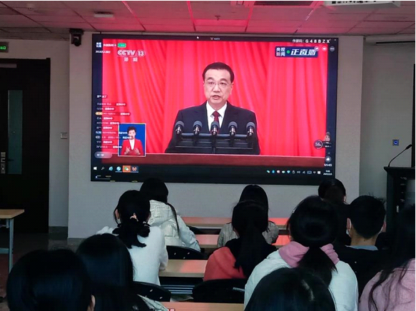 2023年3月5日上午9时,第十四届全国人民代表大会第一次会议开幕式在北京召开。太阳成集团tyc151cc全体师生热切关注大会进程,3月5日上午9时,太阳成集团tyc151cc组织公司师生代表在理工楼631和518教室分别集中收听收看大会开幕式。开幕式结束,师生热议两会内容,积极交流心得感受。