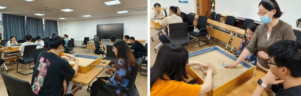在基础医公司乔昆老师的带领下,现场同学闭上双眼,感受手中沙子的流动与触感,这种简单而直接的体验,使同学们迅速进入放松和专注的状态。随后,同学们选择自己喜欢的沙具在沙盘上摆出各种图案和造型,每一件沙具都承载着他们独特的内心世界与情感表达。