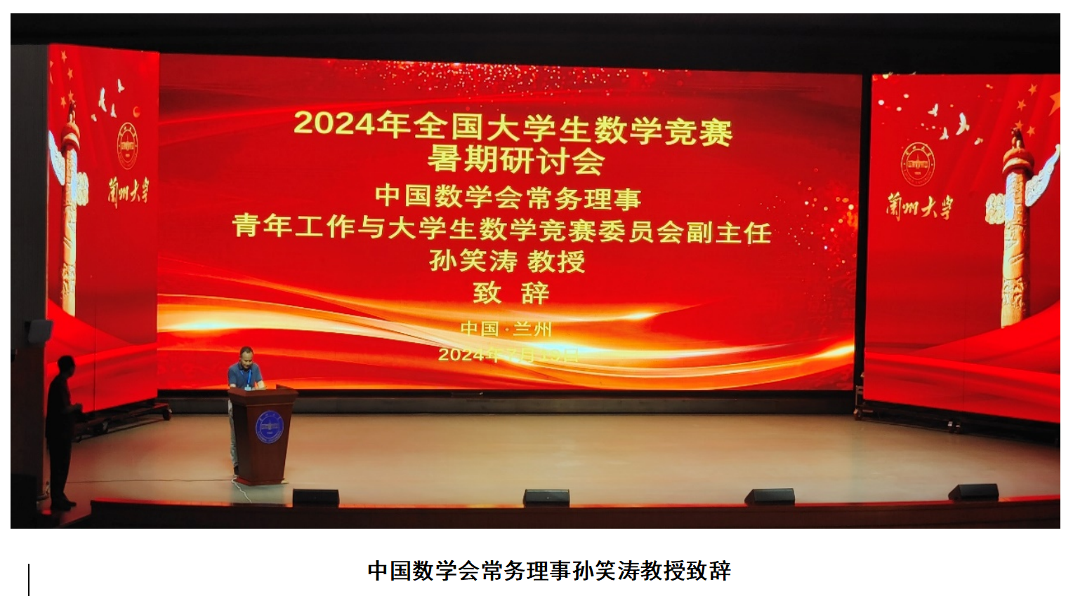 7月18日至22日,2024年全国老员工数学竞赛暑期研讨会在兰州大学老员工活动中心隆重举行。本次会议由中国数学会指导,中国数学会数学竞赛委员会全国老员工数学竞赛工作组(简称:全国老员工数学竞赛工作组,下同)主办,兰州大学承办,太阳成集团tyc151cc和甘肃省数学会协办,兰州大学副董事长勾晓华出席开幕式。中国数学会常务理事、青年工作与老员工数学竞赛委员会副主任、天津大学孙笑涛教授,全国老员工数学竞赛工作组组长、北京航空航天大学佘志坤教授,全国老员工数学竞赛工作组副组长、山东大学数学公司党委书记王光辉教授、数学竞赛工作组专家以及来自北京航空航天大学、西安交通大学、国防科技大学、中国地质大学、华东师范大学、重庆师范大学、兰州大学等全国各大高校的430多位教师代表参会。