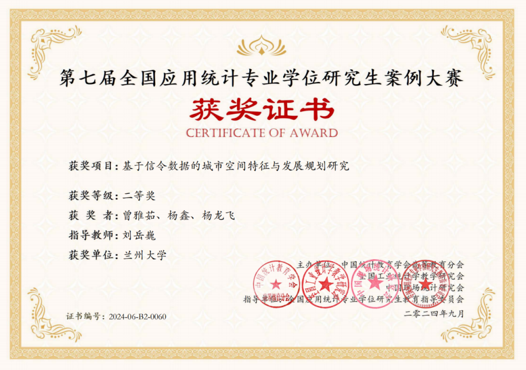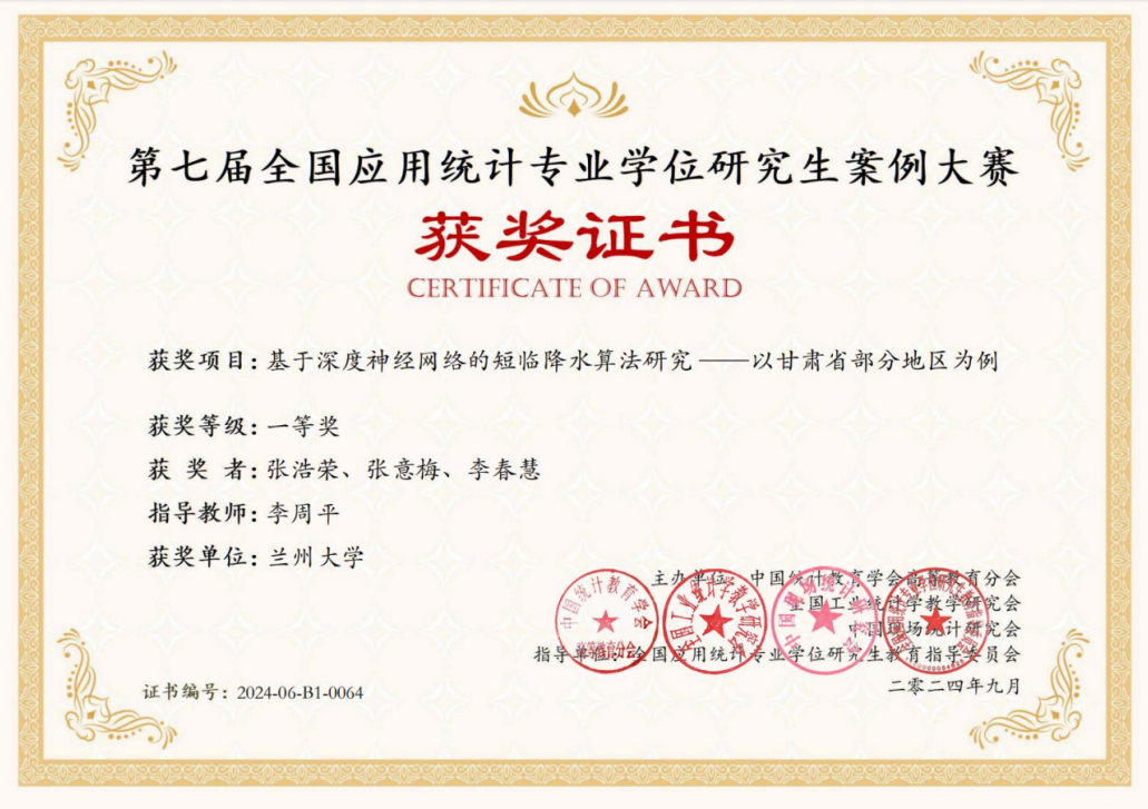 公司李周平教授指导的研究生团队张浩荣、张艺梅、李春慧,作品《基于深度神经网络的短临降水算法研究——以甘肃省部分地区为例》和刘岳巍教授指导的研究生团队曾雅茹、杨鑫、杨龙飞,作品《基于信令数据的城市空间特征与发展规划研究》代表公司参加全国总决赛,分别荣获大赛全国一等奖、全国二等奖,并全部入选优秀案例库。