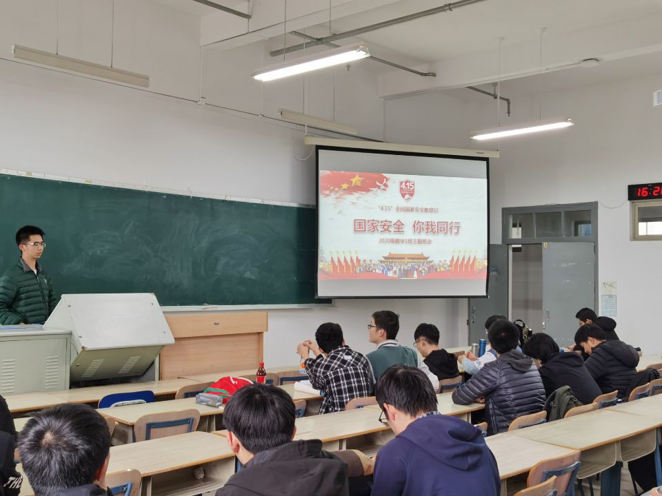 2021年4月15日下午4:15,2020级数学类1班召开国家安全主题教育班会。班会主题为“践行总体国家安全观,统筹发展和安全,统筹传统安全和非传统安全,营造庆祝建党100周年良好氛围”.