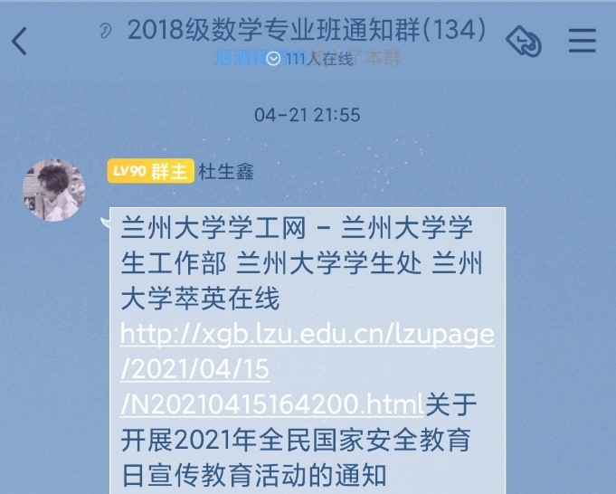 2019级基地班于2021年4月15日在榆中校区第二教学楼A114开展了国家安全教育的主题班会,时值4月15日第六个全民国家安全教育日。班会主题为“践行总体国家安全观,统筹发展和安全,统筹传统安全和非传统安全,营造庆祝建党100周年良好氛围”,使国家安全概念普及化,每人都构筑起一道保卫国家的安全长城。