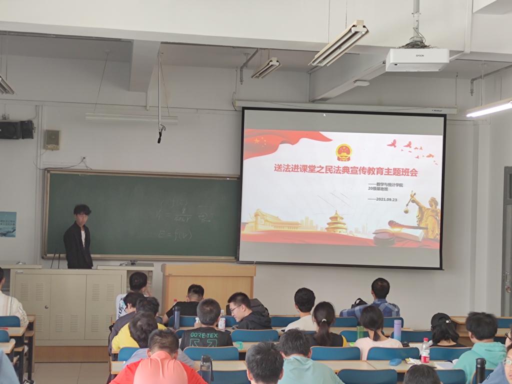 2021年9月24号下午4点,20级数学基地班全体成员在榆中校区天山堂a501教室召开送法进课堂之民法典主题班会,开展法制宣传活动。班会由20级基地班班长李博晗主持,20级基地班全体同学参加。