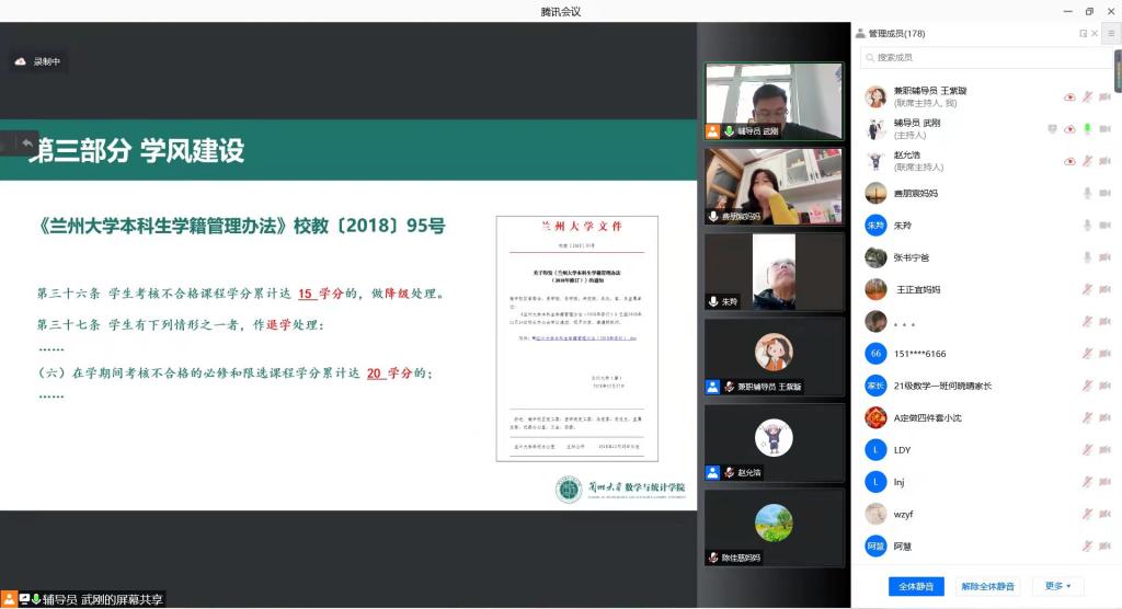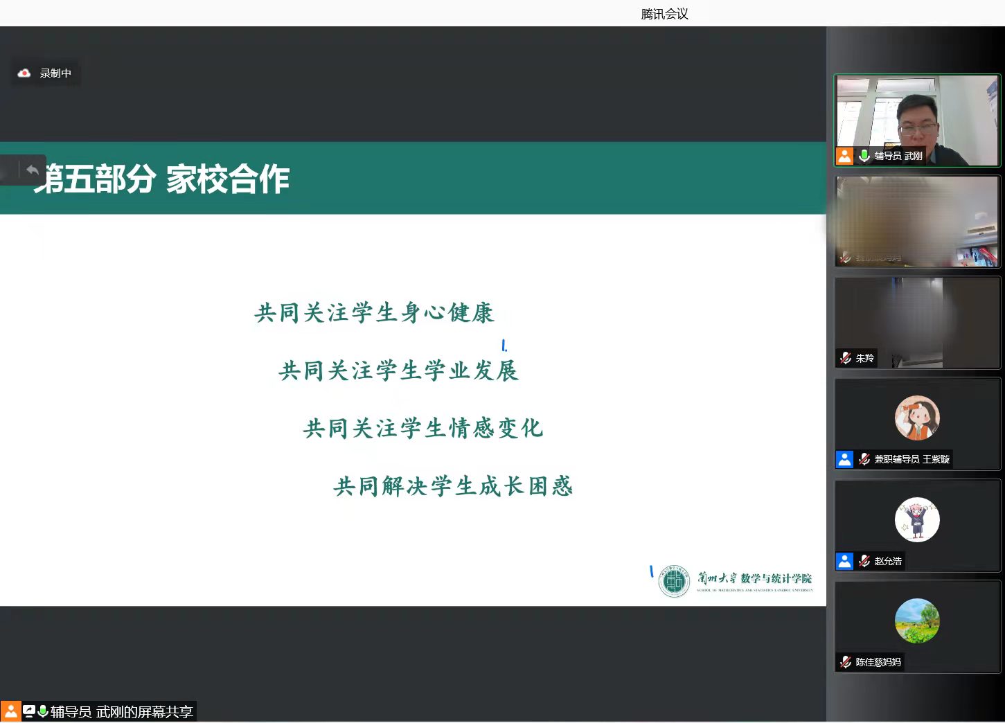 家长会上,2021级本科生辅导员武刚从校院简介、学情概况、学风建设、日常管理、家校合作等方面内容向员工家长进行介绍。一是围绕《兰州大学本科生学籍管理办法》中的规定做了解释说明,强调了降级、退学规定对同学们的影响,引导家长朋友们支持公司公司产品工作,共促员工学业发展。二是详细介绍了公司通过开设本科生晚自习、组织专业学习兴趣小组、开设高数辅导室等具体举措推动班风学风建设。三是对疫情防控、本科生宿舍“晚点名”、请销假管理、宿舍安全管理工作开展情况向家长做了通报,呼吁家校积极沟通,做好日常管理工作。四是提倡家校合作,做好四个“共同”,即共同关注员工身心健康、共同关注员工学业发展、共同关注员工情感变化、共同解决员工成长困惑,帮助员工取得长足发展。会议最后,辅导员还就本学期期末考试与放假有关安排做了说明,提醒家长朋友协助员工做好假期规划。