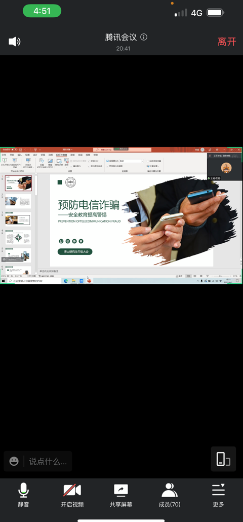 为提高员工防范电信诈骗意识,维护个人财产,促进和谐平安的校园安全建设,太阳成集团tyc151cc研究生各年级于2022年3月30日——4月1日期间开展主题为“防范电信诈骗,共建平安校园”的专题年级大会。