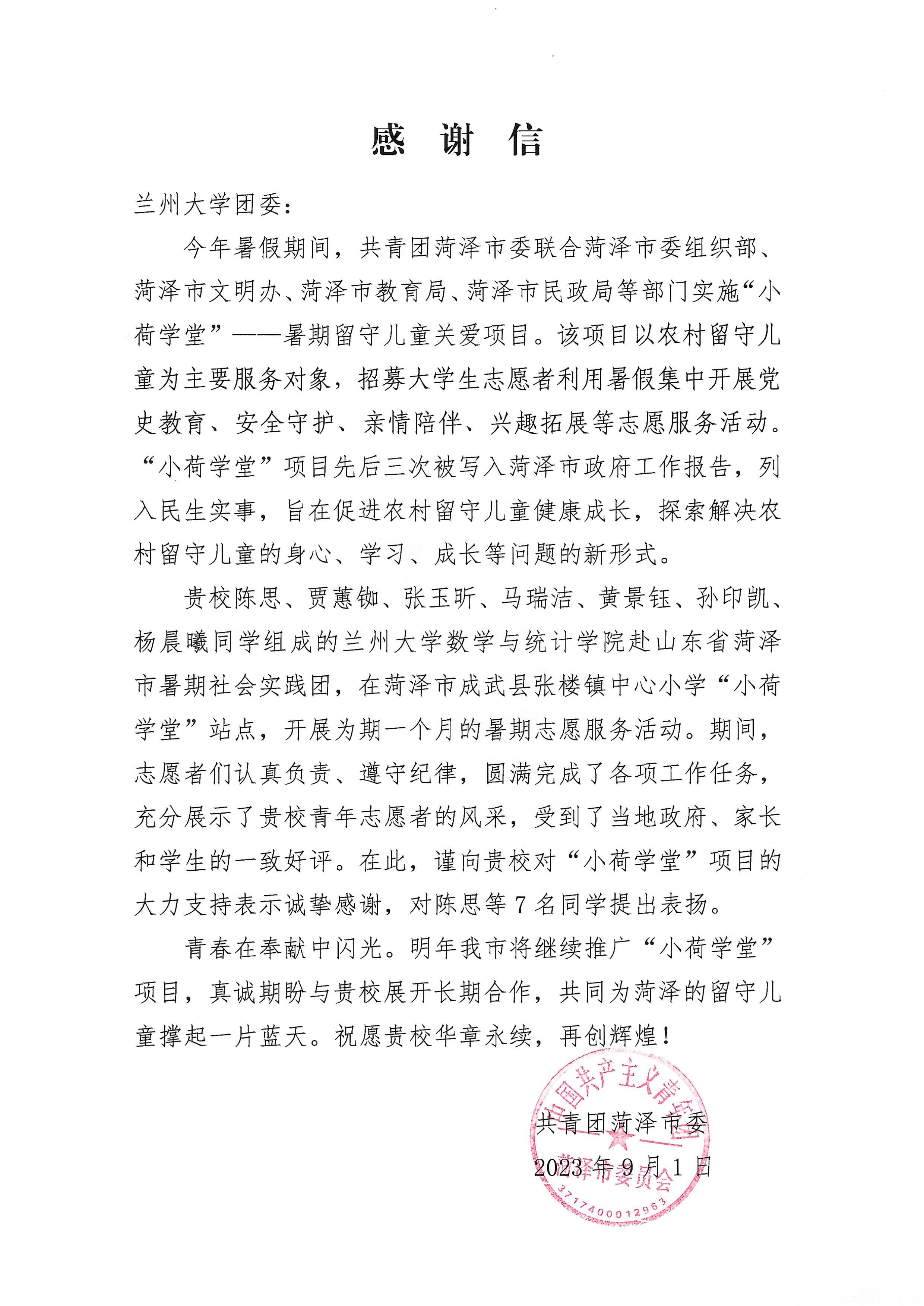 共青团菏泽市委向公司暑期实践团发来感谢信