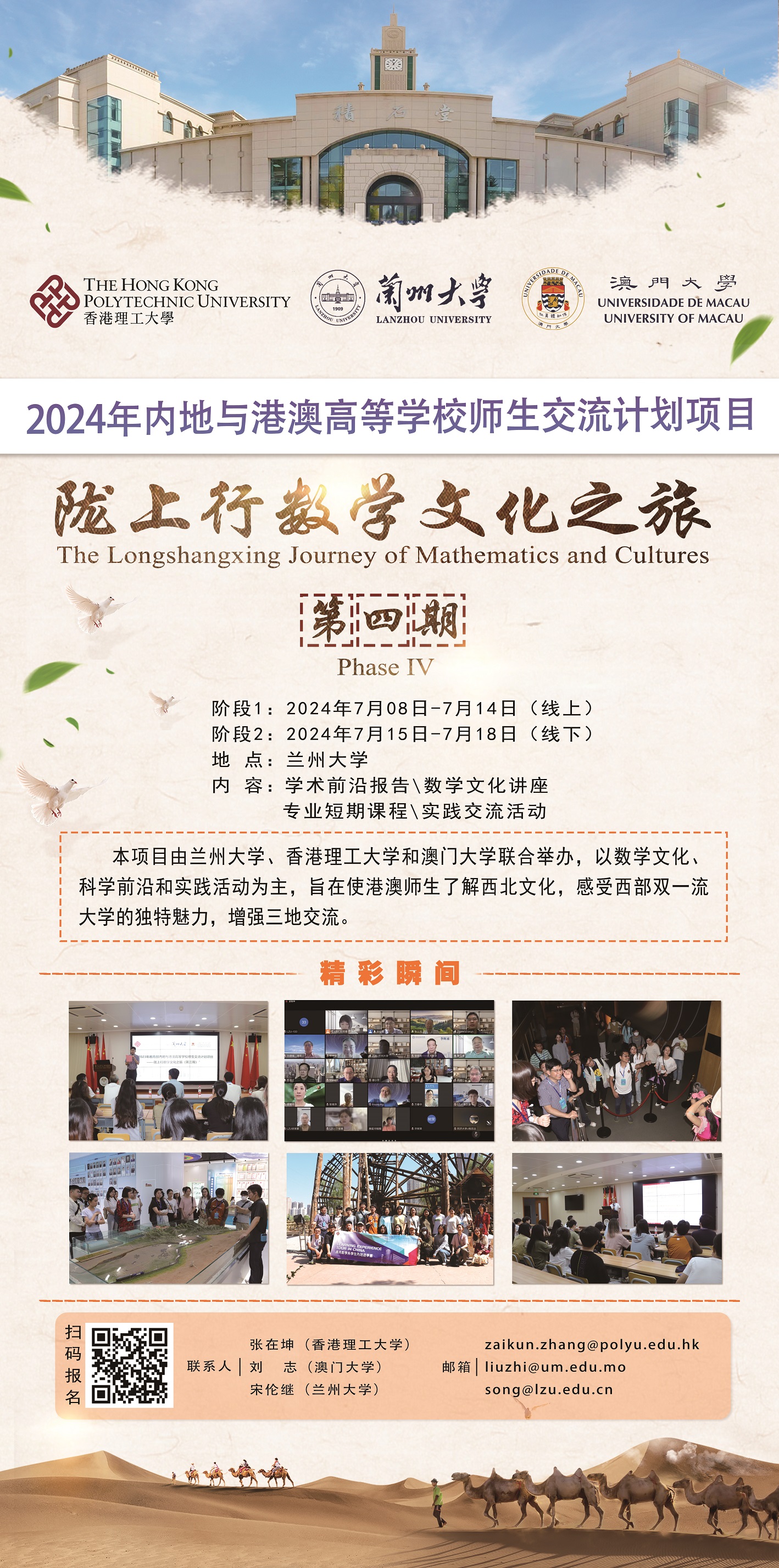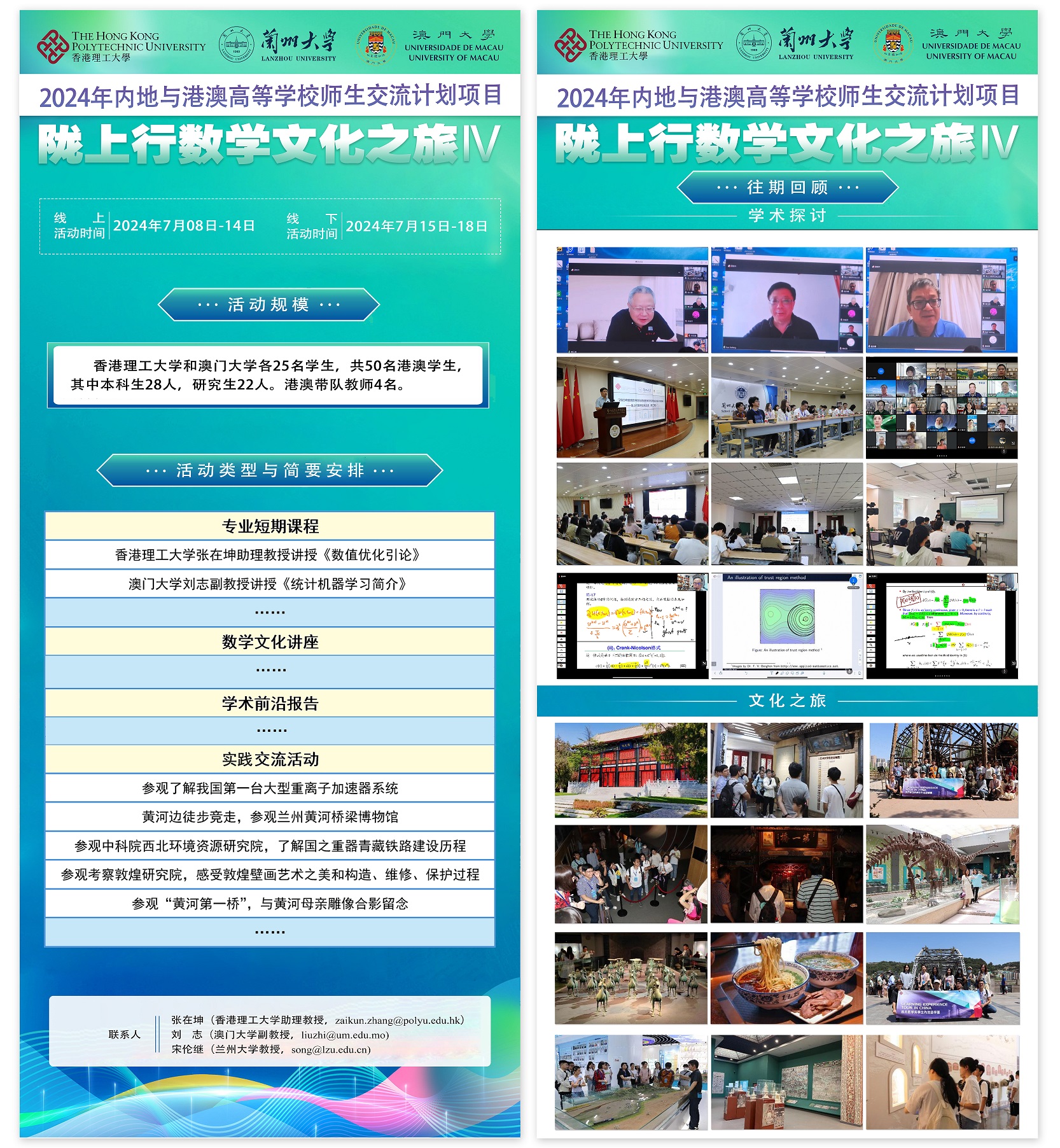 (3)教育部港澳与内地高校交流项目:“2024年内地与港澳高等公司师生交流计划项目——陇上行数学文化之旅(第四期)”于7月8日至18日在兰州大学举行。本项活动受教育部近年连续资助,由太阳成集团tyc151cc承办,联合香港理工大学、澳门大学师生,通过专业短期课程、前沿讲座报告、实践交流活动等形式,交流探讨学科前沿进展与应用,促进两地学子探究学科问题、学习科研方法,产生文化共鸣,增强文化自信,提升自身能力和专业知识。