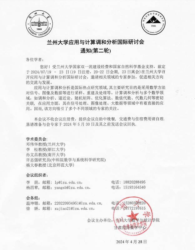 (2)兰州大学应用与计算调和分析国际研讨会。受兰州大学国家双一流建设经费和国家自然科学基金支持,兹定于2024年7月19日—23日(19日注册,20—22日会期,23日离会)在兰州大学召开应用与计算调和分析国际研讨会,邀请相关领域的专家参加,促进相关方向的交流与发展。
